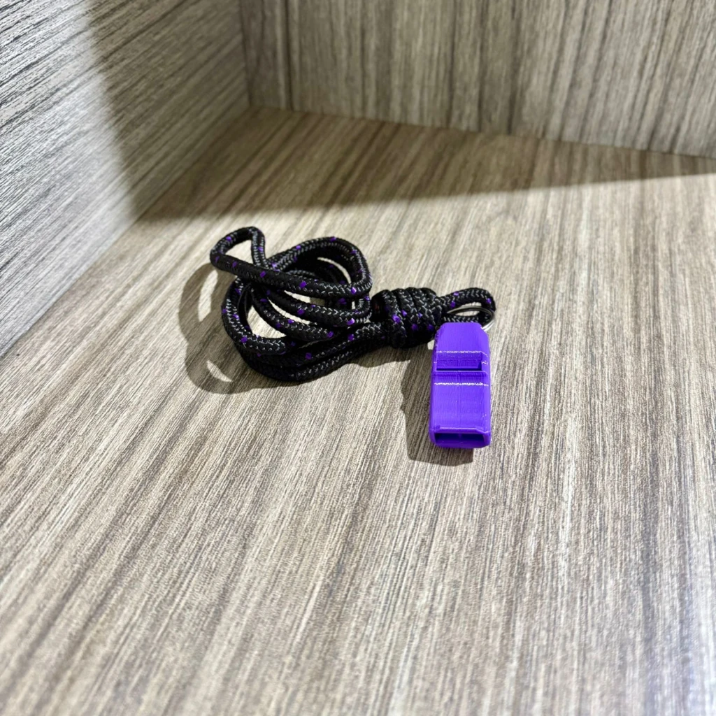 Silbato VIOLETA con cordón de cuello ajustable. Su sonido potente y claro es ideal para señalizar en ambientes cerrados y abiertos.